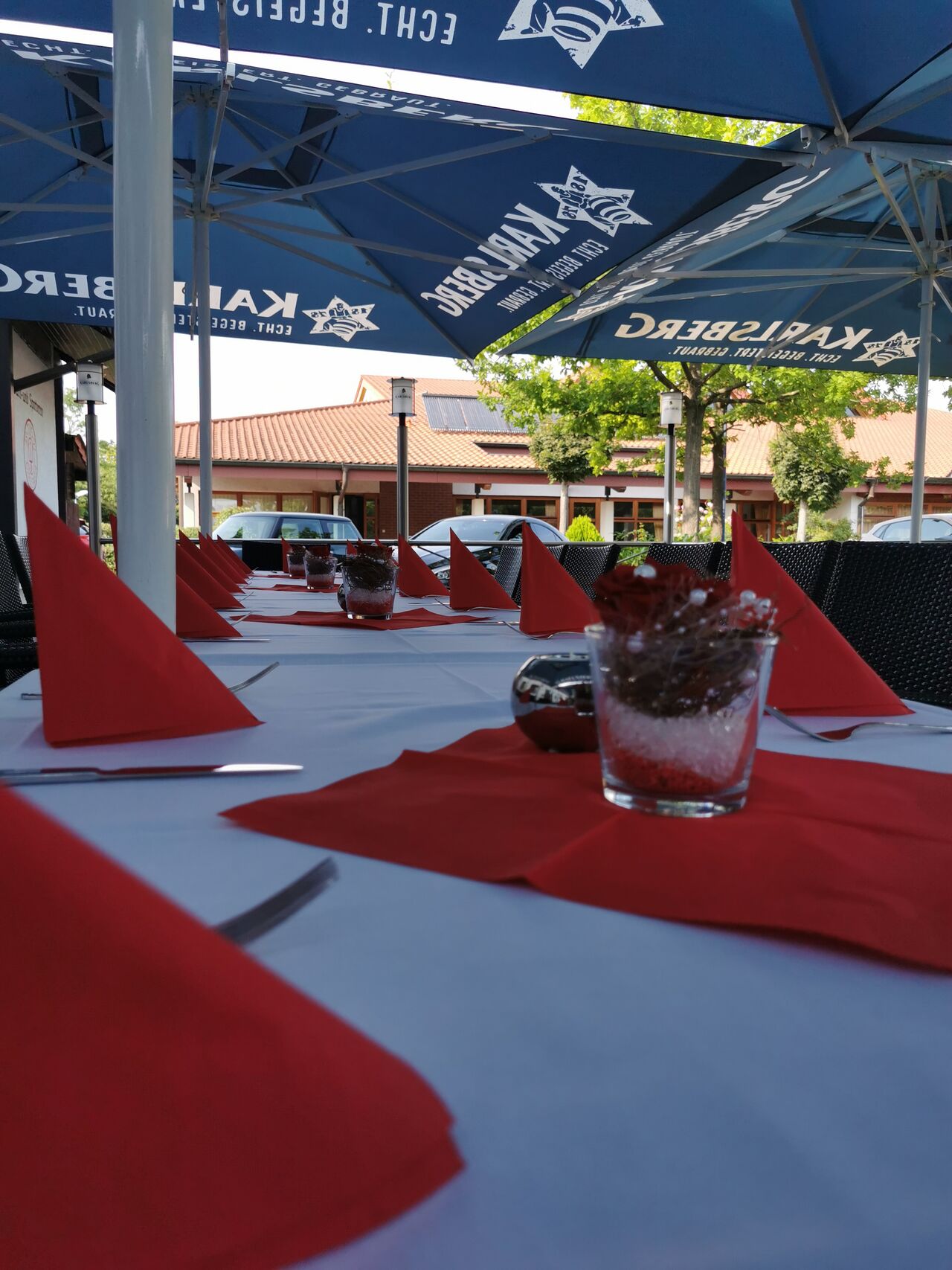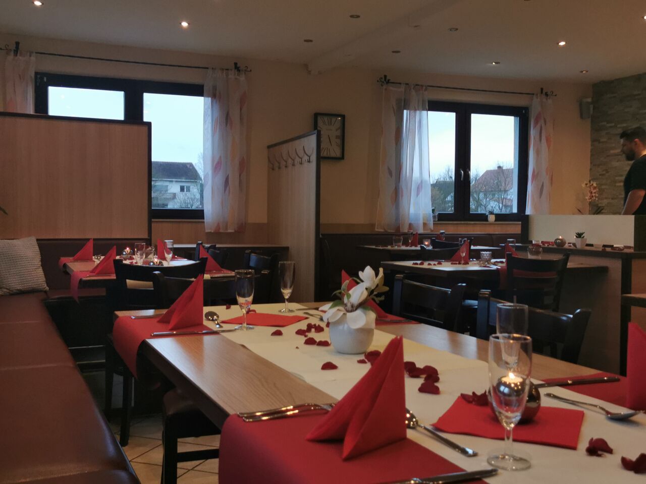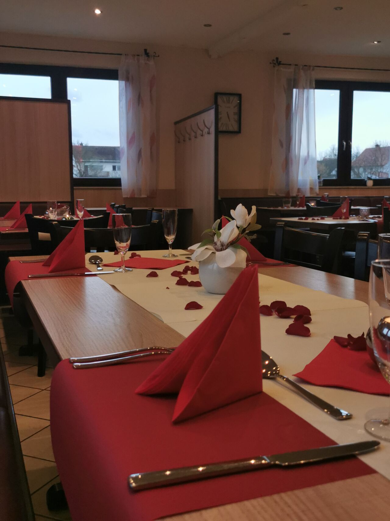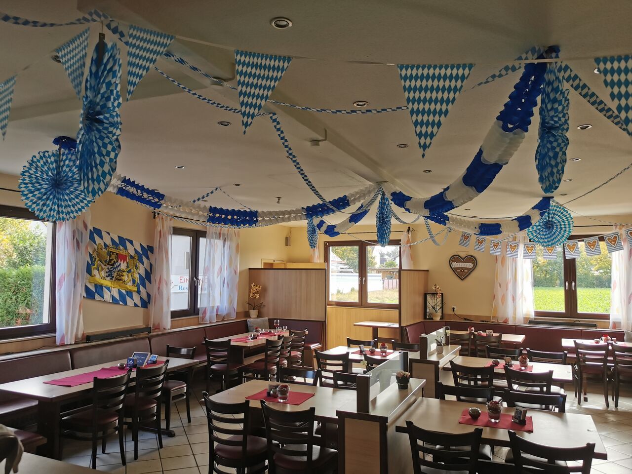 Vor dem Restaurant gibt es kostenfreie Kundenparkplätze. Uns ist es wichtig, dass wir alle Menschen willkommen heißen können. Aus diesem Grund haben wir einen barrierefreien Zugang. Damit auch Hundebesitzer in den Genuss eines Aufenthalts bei uns kommen, sind Haustiere bei uns im Biergarten erlaubt. Reservierungen sind bei uns ganz unkompliziert über unsere Online-Reservierung möglich. Sie können bei uns ganz einfach per Debitkarte zahlen. Keine Zeit? Dann bestellen Sie Ihr Essen ganz einfach zum Mitnehmen. Gerne können Sie Ihre Privatveranstaltung bei uns abhalten. Fragen Sie einfach an! Bei Interesse können Sie bei uns zudem Ihre Hochzeit feiern. Wir sind auf Großveranstaltungen spezialisiert und tun alles, damit Ihr besonderer Tag für Sie unvergesslich schön wird. 6 Tage die Woche haben wir von 16.00-22.00 Uhr für Sie geöffnet. Montags haben wir geschlossen.